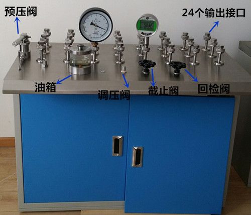 产品介绍 SD-318多输出口压力校验台由调压阀,回检阀,预压阀和截止阀,压力输出接口组成,整体固化结构,样式新颖,操作简单,便于维护,具有密封性能好,升压平稳,速度快,省力,操作简单等优点。多输出口压力表校验台,24个输出接口,一次可检同量程多块压力表,量大压力检定的好解决方案,不同输出接口可根据需要定制。 主要用途: 校验压力(差压)变送器、精密压力表、普通压力表、其它压力仪器仪表时,该压力泵主要用于提供稳定的高压压力。 技术参数: 1.量程:0~60MPa